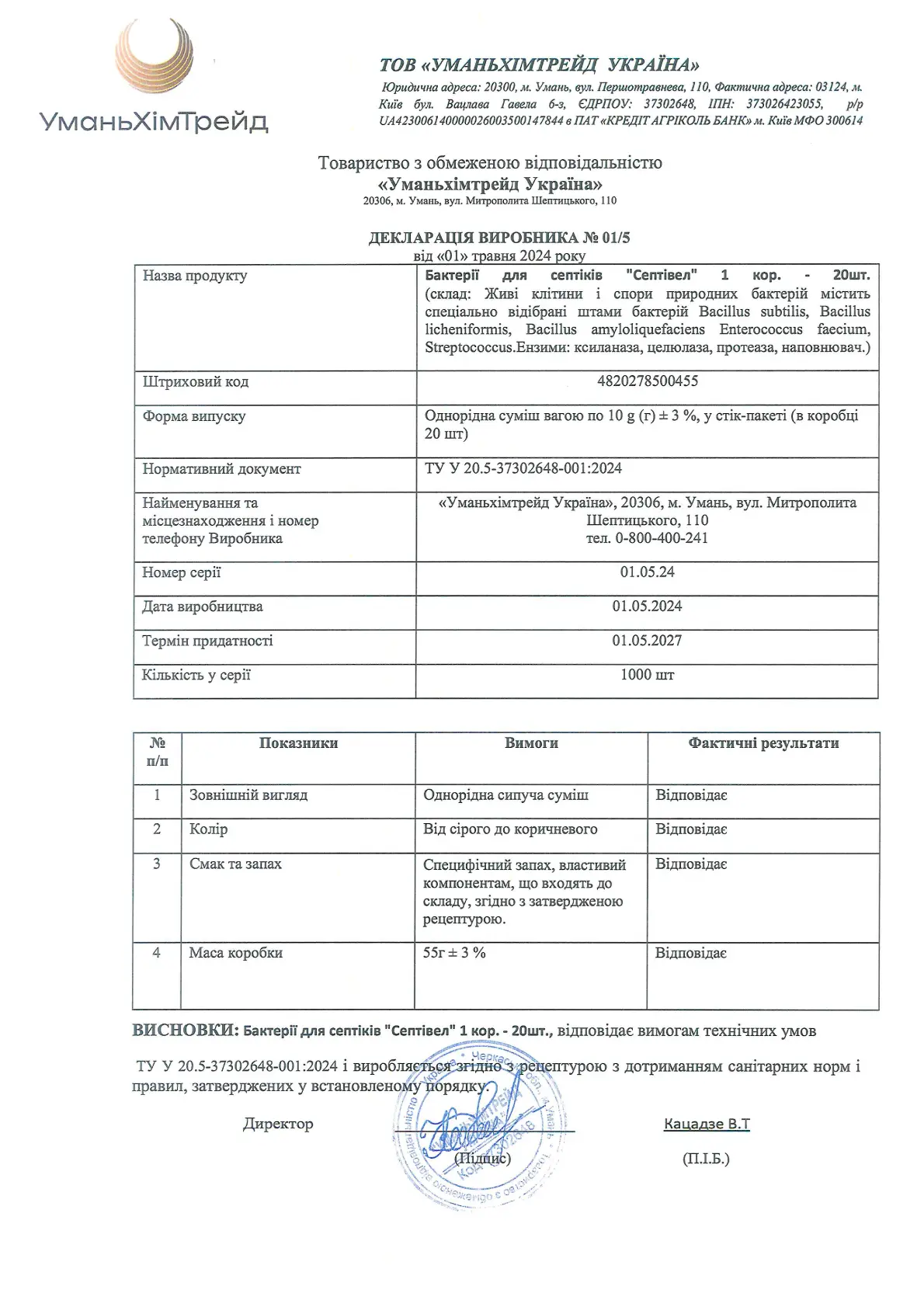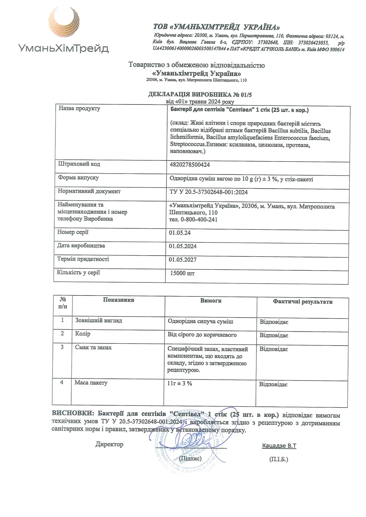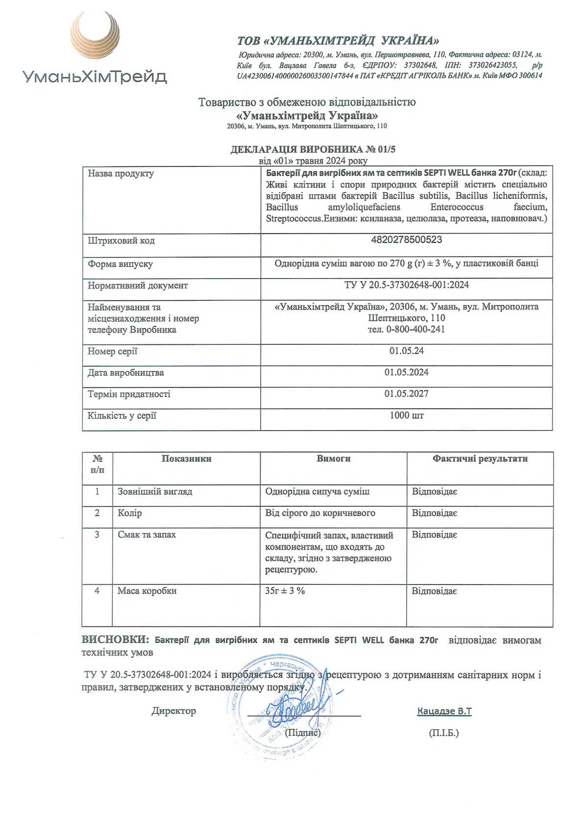 Декларація підтверджує відповідність бактерій для септиків, вигрібних ям та компосту Septi Well рідиною (500 г) усім технічним вимогам. Продукт містить живі клітини та спори спеціально відібраних бактерій, які ефективно розкладають органічні відходи, усувають запах.