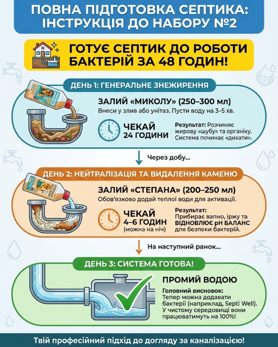 Комплексний догляд за септиком та трубами: Микола + Степан + Бактерії Septi Well – Повне очищення та біоактивація